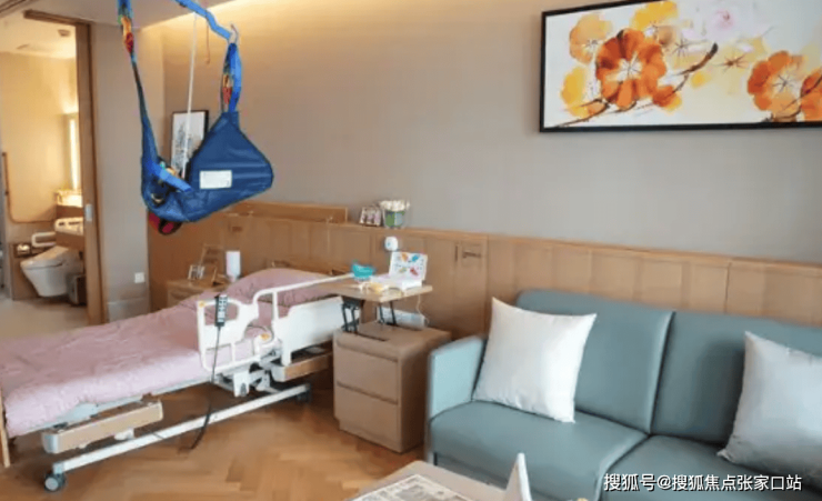 所有户型均采用南北通透设计,落地窗与天窗组合实现全天候自然采光,新风系统与地暖系统联动调节温湿度。单人间、双人间及一室一厅套房均配备独立卫浴,卫浴区域采用无高差地面、恒温水龙头与双向淋浴扶手,智能护理床可调节至15种体位,满足阅读、用餐、康复等多元需求。房间内设置智能穿戴设备,实时监测健康数据,护理站根据数据动态调整照护方案。